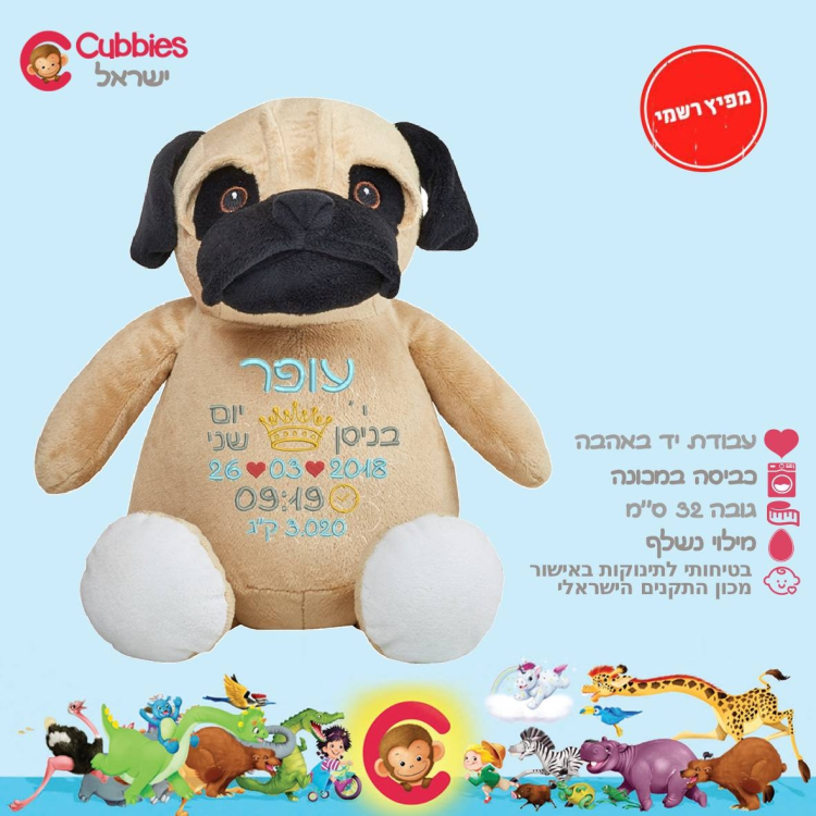 בובה עם רקמה בדמות כלב פאג בעיצוב אישי.