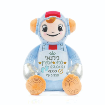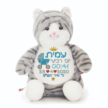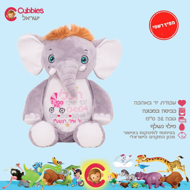 בובה עם רקמה בדמות פיל בתסרוקת בעיצוב אישי.