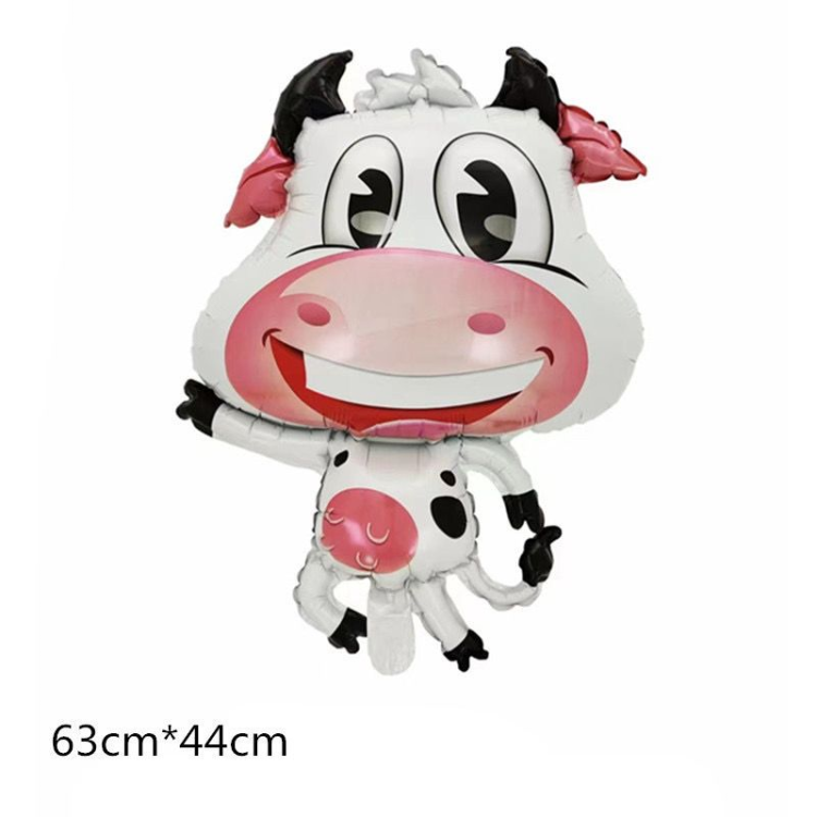 בלון הליום בצורת פרה חמודה ומאוירת עם חיוך רחב, מושלם לימי הולדת, מסיבות ילדים ואירועים צבעוניים ומצחיקים.