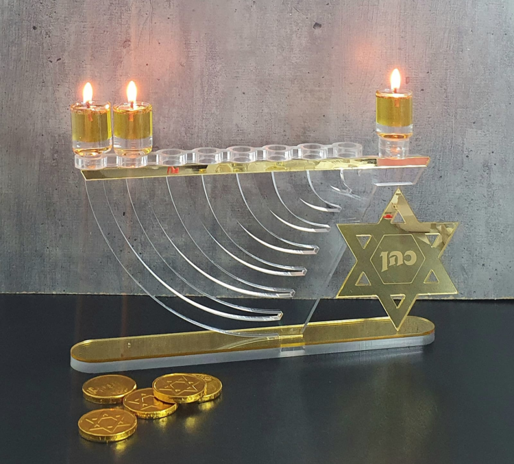 חנוכיה יוקרתית מאקריל עם מגן דוד זהב ממותג.