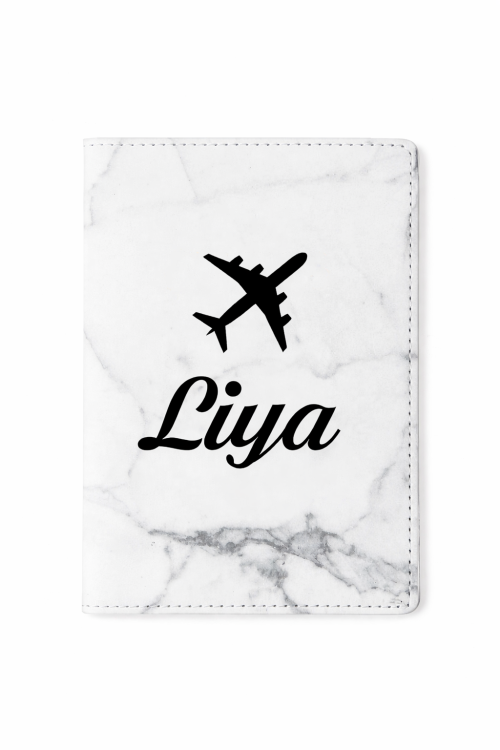 כיסוי דרכון לבן שיש עם אופציה להוספת שם. השם מודבק באמצעות מדבקת ויניל שאינה יורדת.