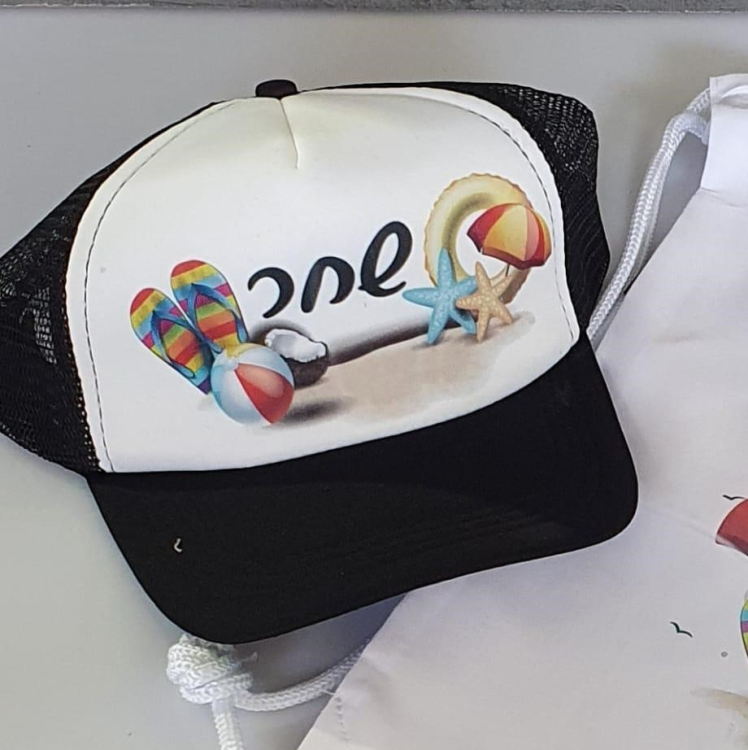 ערכת קיץ צבעונית ומלאת סטייל הכוללת כובע רשת ותיק חוף מבד עם שרוך, בעיצוב קייצי מושלם!