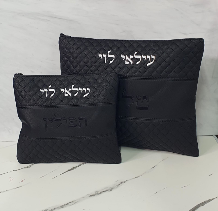 סט כיסוי לטלית ולתפילין – דמוי עור שחור עם רקמה