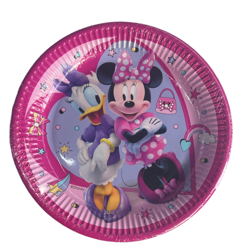 סט צלחות נייר גדולות בעיצוב מתוק וצבעוני של מיני מאוס ודייזי, בגווני ורוד אהובים. מושלם למסיבת יום הולדת לבנות, מסיבת מיני מאוס או כל חגיגה שמחה וצבעונית.