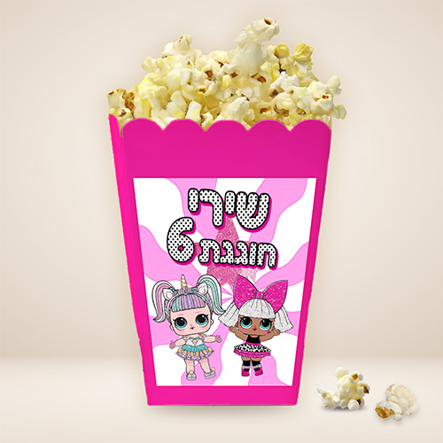 קופסת פופקורן צבעונית בעיצוב אישי עם דמויות LOL Surprise האהובות – מושלמת לימי הולדת, מסיבות נושא, ואירועים לילדים! עם שם הילדה וגיל החוגגת בעיצוב נוצץ, לבחירתכם.