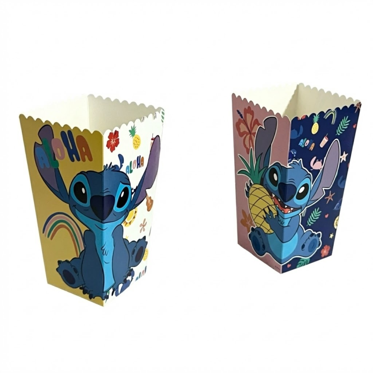 סט קופסאות פופקורן קרטון בעיצוב צבעוני ומשמח של הדמות האהובה סטיץ’. כל קופסה עם הדפס שונה, מושלם לימי הולדת, מסיבות קיץ, מסיבת חוף או ערב סרטים ביתי.
