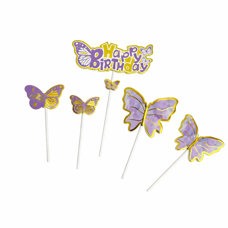 סט טופרים מעוצב לקישוט עוגות יום הולדת, הכולל כיתוב “Happy Birthday” ופרפרים אלגנטיים בגווני סגול עם נגיעות זהב. הטופרים מוסיפים מראה יוקרתי, עדין וחגיגי לכל עוגה ומתאימים במיוחד לימי הולדת, מסיבות בנות ואירועים בעיצוב רומנטי.