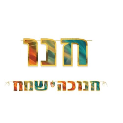 שרשרת אותיות חגיגית עם הכיתוב “חנוכה שמח”, בעיצוב צבעוני ומבריק עם אפקט זהב.