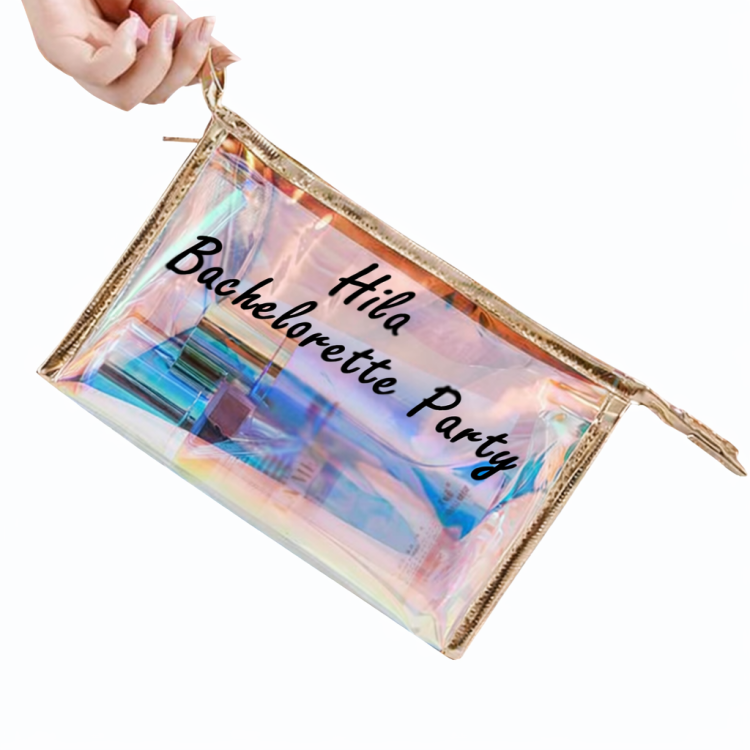 התיק עשוי חומר שקוף איכותי עם אפקט הולוגרפי זוהר, בשילוב רוכסן מוזהב ועיצוב אלגנטי. ניתן להוסיף הדפסה אישית עם שם הכלה וכיתוב מיוחד, שהופכים כל תיק לפריט אישי ומרגש.