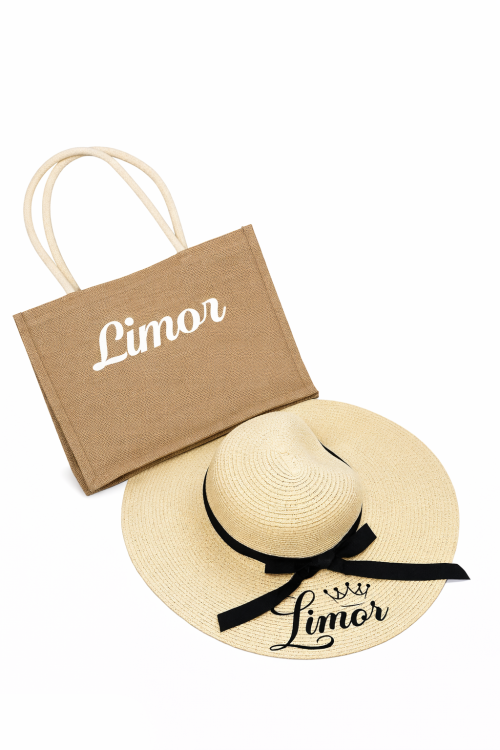 כוללת תיק יוטה איכותי וכובע רחב שוליים עם סרט בד שחור – שניהם עם מיתוג אישי לבחירה.